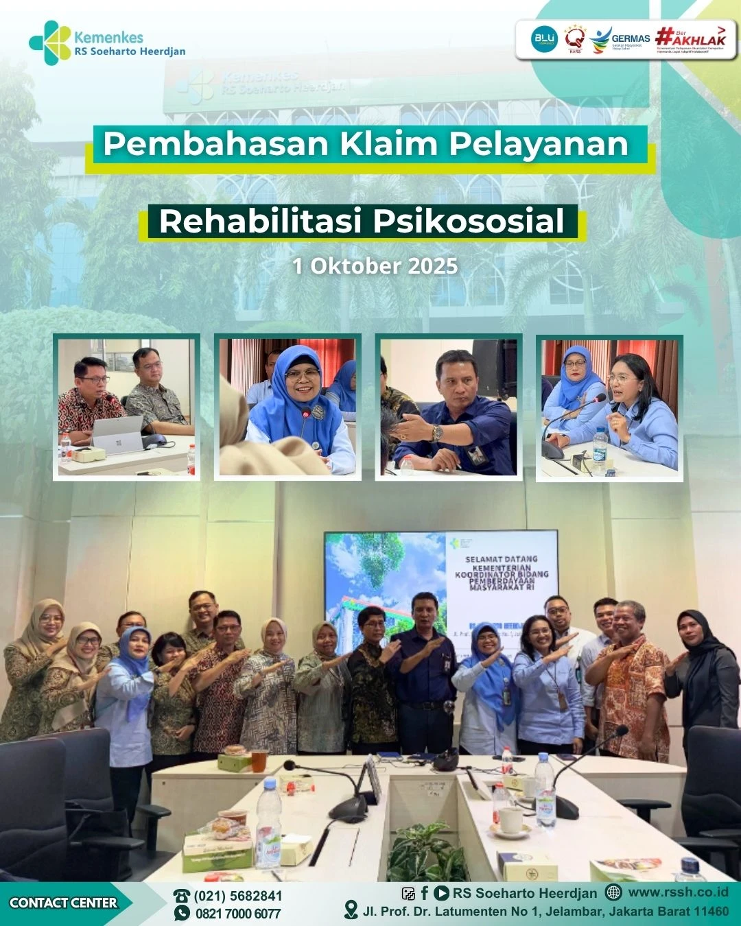 Jakarta, 1 Oktober 2025 – Pada tanggal 1 Oktober 2025 di RS Soeharto Heerdjandiadakan pertemuan pembahasan klaim dispute/pending rehabilitasi psikososial yang dihadiri staf ahli Kemenko Bidang Pemberdayaan Masyarakat diwakili Diah Tri Kumolosari A.KS., M.Si; Unsur Dewan Jaminan Sosial Nasional diwakili Muttaqien MPH, Ak dan Royanto Purba ST; BPJS Kesehatan diwakili dr. Ari Dwi Aryani MKM selaku deputi direksi bidang penjaminan manfaat ,dr. Mulyo Wibowo selaku deputi direksi wilayah IV, dan drg. Unting Patri Wicaksono, MM, Aak selaku kepala BPJS jakarta Barat; dan PP PDKSJI diwakili dr. Agung Frijanto, MH selaku wakil ketua umum. Dari RS Soeharto Heerdjan diwakili direktur utama, dr. Desmiarti Sp.KJ, M.A.R.S.; direktur medik keperawatan, dr. Parulian Sandy Noveria MKK; direktur perencanaan keluangan dan operasional, Evi Nursafinah, SE. MPH.; kepala instalasi rehabilitasi psikososial, dr Willy Steven Sp.KJ; dan unit terkait lain. Dalam pertemuan itu dibahas secara detail kronologis yang terjadi. hingga menimbulkan kesepakatan sebagai solusi klaim rehabilitasi psikososial dalam JKN