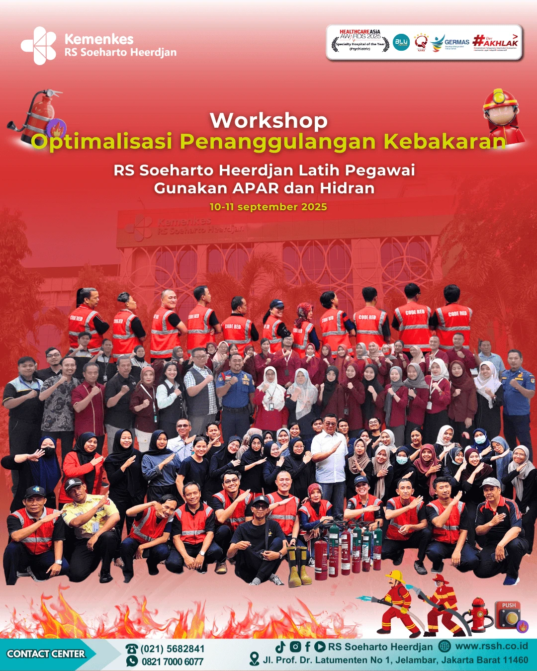 Rumah Sakit Soeharto Heerdjan menyelenggarakan Workshop Optimalisasi Penanggulangan Kebakaran di Fasilitas Pelayanan Kesehatan Angkatan 1, (10–11 September 2025). Kegiatan ini diikuti oleh pegawai dari berbagai unit kerja di lingkungan rumah sakit, sebagai bentuk komitmen dalam meningkatkan kesiapsiagaan dan respons cepat terhadap potensi bahaya kebakaran.