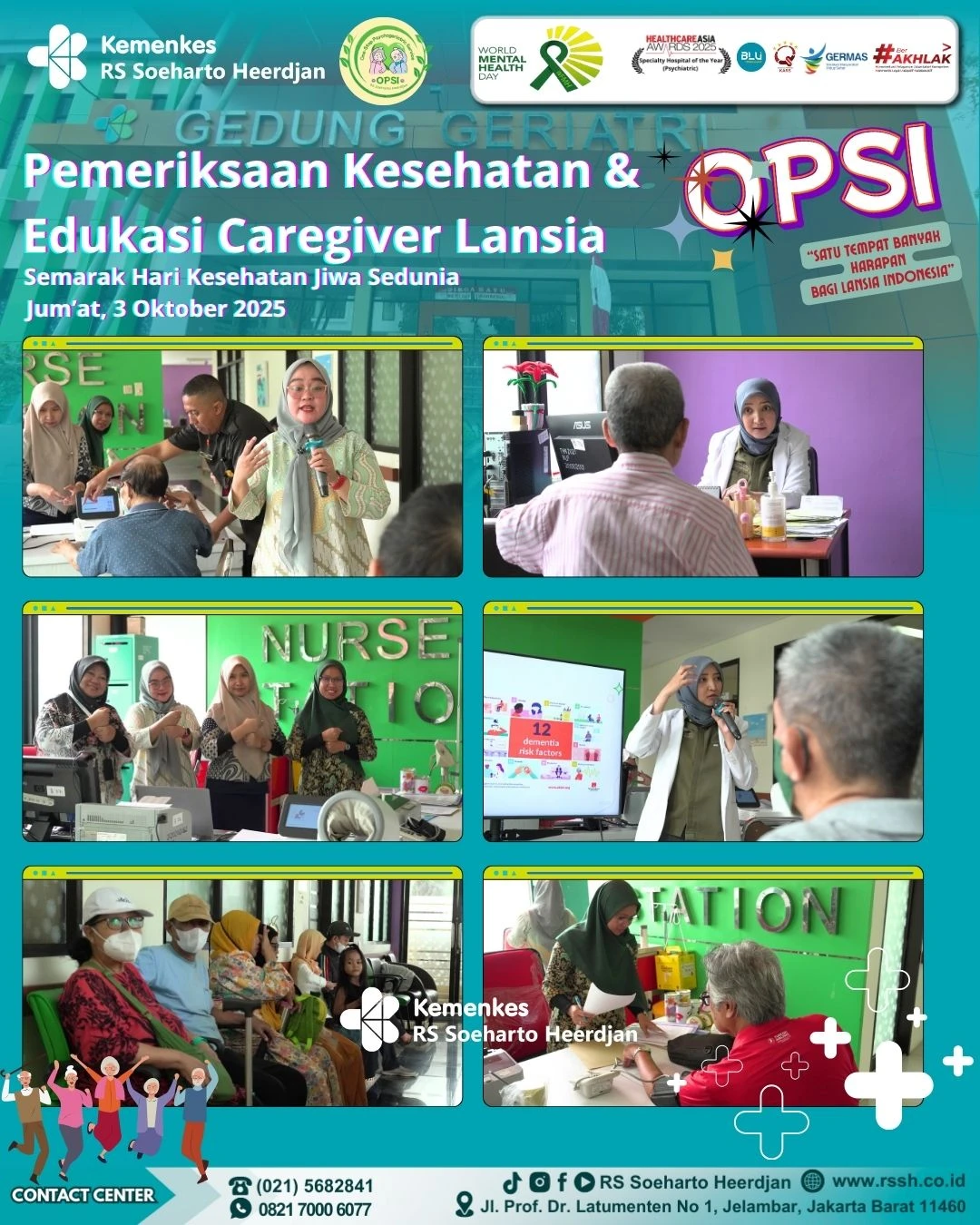 Pada 3 Oktober 2025, Instalasi Psikogeriatri Rumah Sakit Soeharto Heerdjan menyelenggarakan kegiatan pemeriksaan kesehatan dan edukasi khusus bagi caregiver lansia. Kegiatan yang menyasar keluarga dan pendamping orang lanjut usia ini menekankan pendekatan non-farmakologis dalam merawat Orang Dengan Demensia (ODD) dan teknik praktis untuk menurunkan kecemasan pasien maupun caregiver. Narasumber pada kegiatan tersebut adalah dr.Arundhati Nugrahaning Aji,SpKj (K), yang membawakan materi terapi non-farmakologi untuk ODD, dan Ns.Rina Sogirin Trisnawati,S.Kep, yang mengajarkan teknik imajinasi terbimbing sebagai cara mengurangi kecemasan.