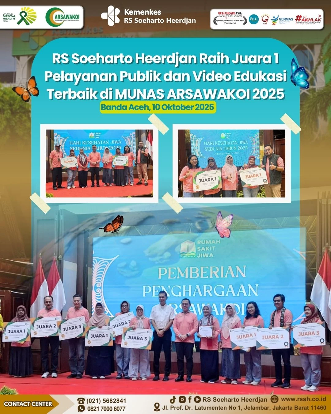 Banda Aceh, 10 Oktober 2025 - RS Soeharto ikut menghadiri perayaan hari kesehatan jiwa sedunia yg diadakan di kota Banda Aceh. RS Soeharto Heerdjan hadir sebagai salah satu anggota ARSAWAKOI memenangkan 2 kategori penghargaan yaitu sebagai juara 1 RSJ dengan pelayanan publik terbaik dan Juara 1 untuk lomba video edukasi dengan tema HKJS.
